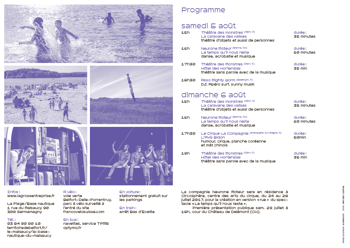 Surfant sur la vague de La Plage des Six Pompes avec le même objectif d’amener la plage à ceux qui n’y vont pas, La Tournée des Plages fait dériver sur le site paradisiaque du Malsaucy (Territoire de Belfort, France) trois des compagnies programmées à La Chaux-de-Fonds :