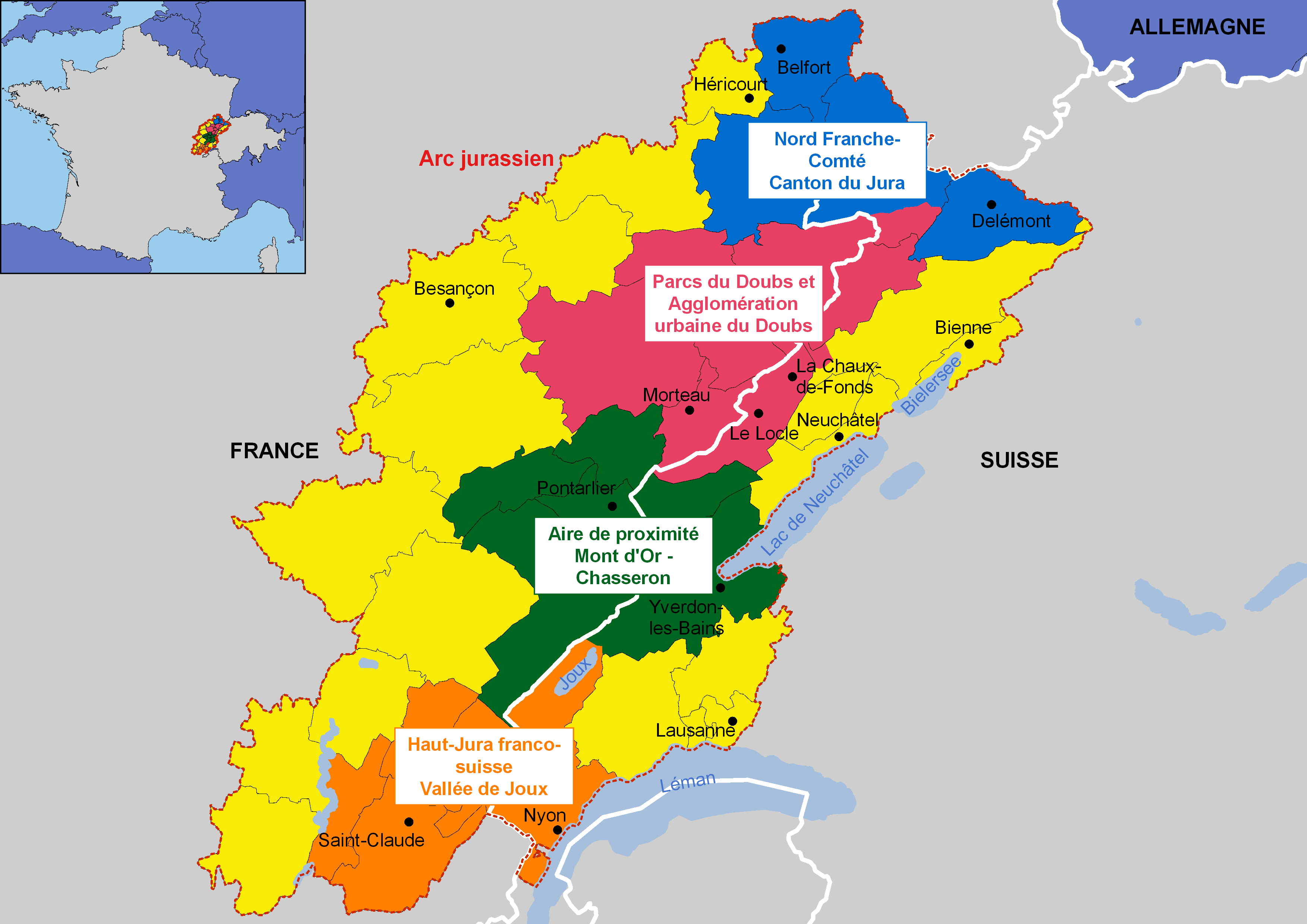 Pour la partie française, ce périmètre comprend 28 établissements publics de coopération intercommunale (EPCI) des trois départements frontaliers de la région Bourgogne-Franche-Comté : Doubs, Jura et Territoire de Bel­fort. Pour la partie suisse, il couvre 15 districts appartenant aux cantons de Berne, Jura, Neuchâtel et Vaud.