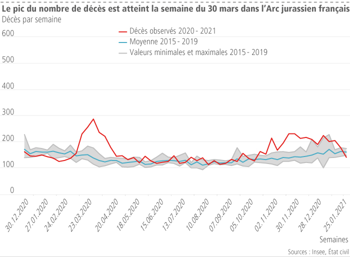 La pandémie de coronavirus débutée au début de l’année 2020 s’est traduite jusqu’au 7 février 2021, dernière date d’actualisation commune des données sur l’ensemble de l’Arc jurassien, par deux vagues importantes de surmortalité : l’une au printemps entre le 9 mars 2020 et le 3 mai 2020 et la deuxième à l’automne à partir du 19 octobre 2020 jusqu’au 10 janvier 2021.