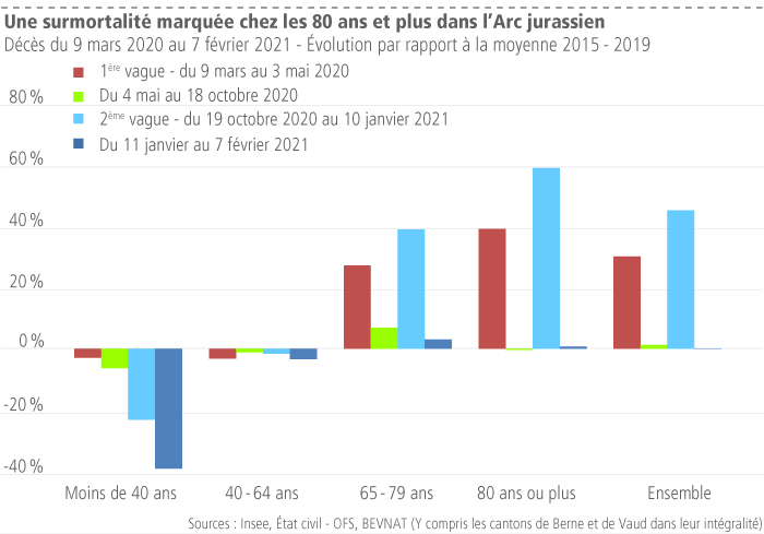 Depuis début mars 2020, le nombre de décès a augmenté de 24 % dans l’Arc jurassien français par rapport à la moyenne de la même période 2015 à 2019, alors que l’Arc jurassien suisse affiche une surmortalité de 15 % depuis le début de la pandémie. Cet écart entre les deux parties de l’Arc jurassien est encore plus marqué pour les personnes âgées de 65 et plus.