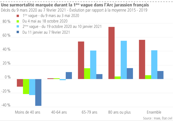 Au cours de la première vague de surmortalité du printemps, l’ensemble de l’Arc jurassien a connu une surmortalité de 1120 personnes par rapport à la moyenne des décès observée sur la période 2015 à 2019, soit une hausse de 30 % des décès. C’est principalement dans sa partie française que la première vague a été la plus meurtrière. En effet, avec 620 décès de plus qu’en moyenne, le nombre de décès s’est accru de 56 % dans l’Arc jurassien français contre 19 % pour la partie Suisse. Cette dernière enregistre 500 décès en excès par rapport à la moyenne des années 2015 à 2019.