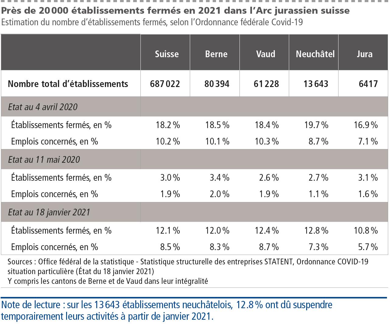 A cette même date, le nombre d’emplois concernés par les fermetures d’entreprises est estimé à près de 100 000 emplois dans les quatre cantons suisses de l’Arc jurassien. Cela représente 17 % de moins que lors de la première vague.