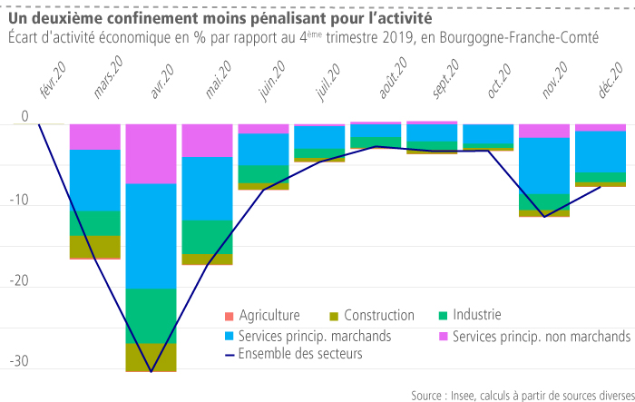 Lors du deuxième confinement annoncé le 28 octobre, la chute de l’activité a été beaucoup moins brutale dans tous les secteurs. En effet la perte d’activité au niveau national était évaluée à - 12 % pour le mois de novembre et à - 8 % pour le mois de décembre au cours duquel un déconfinement a été amorcé.