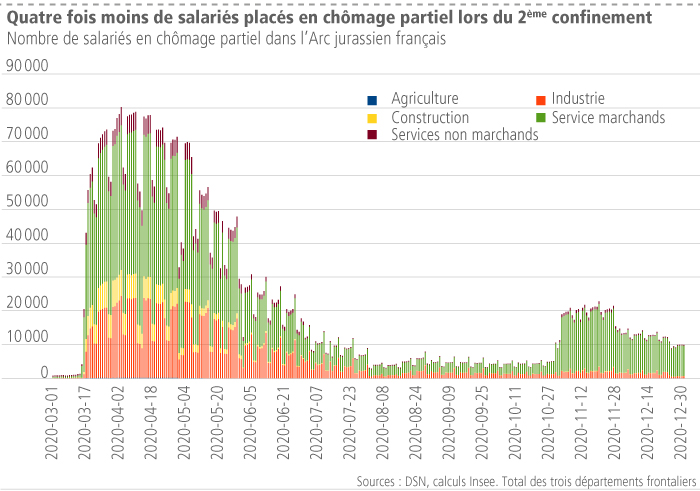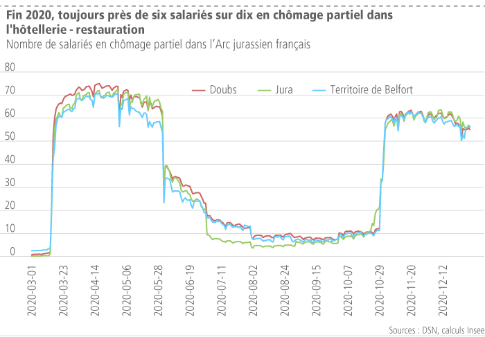 Au plus fort du premier confinement, près de 80 000 salariés étaient en chômage partiel dans l’Arc jurassien français, à mi-juin ils n’étaient plus que 20 000 et 5000 ensuite dans le courant de l’été. Début novembre, leur nombre est remonté à 20 000 salariés et, suite au déconfinement du 15 décembre, il est retombé à 10 000 salariés en fin d’année, dont près de 5500 salariés dans le secteur de l’hébergement - restauration, en raison du maintien de la fermeture au public des restaurants. Dans ce secteur, depuis début novembre, 60 % des salariés sont en chômage partiel, soit moins qu’au printemps, davantage d’établissements proposant de la vente à emporter.