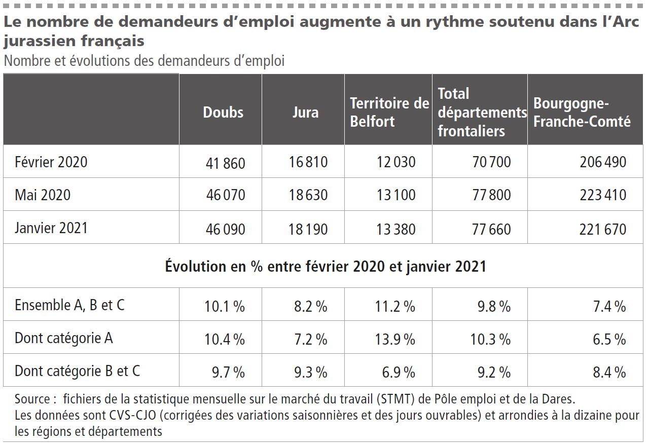 En janvier 2021, l’Arc jurassien suisse compte 25 630 chômeurs, soit 6830 de plus qu’en février 2020 (+ 36,4 %). C’est essentiellement durant le premier confinement que le nombre de chômeurs a fortement augmenté (plus 4980 chômeurs, soit + 26,5 %), alors que la hausse est plus contenue entre avril 2020 et janvier 2021 (1850 chômeurs en plus, soit + 7,8 % .