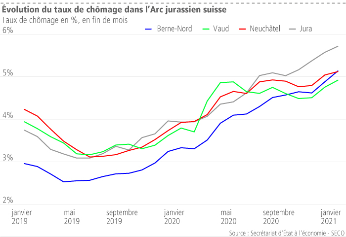 Le taux de chômage de l’Arc jurassien suisse, selon le SECO, se situait à 3,7 % en février 2020 et une forte croissance s’en est suivie, liée au brusque arrêt de l’activité économique. Après s’être stabilisé autour à 4,6 % entre septembre et novembre 2020, le taux de chômage est reparti à la hausse pour s’établir à 5 % à fin janvier 2021.