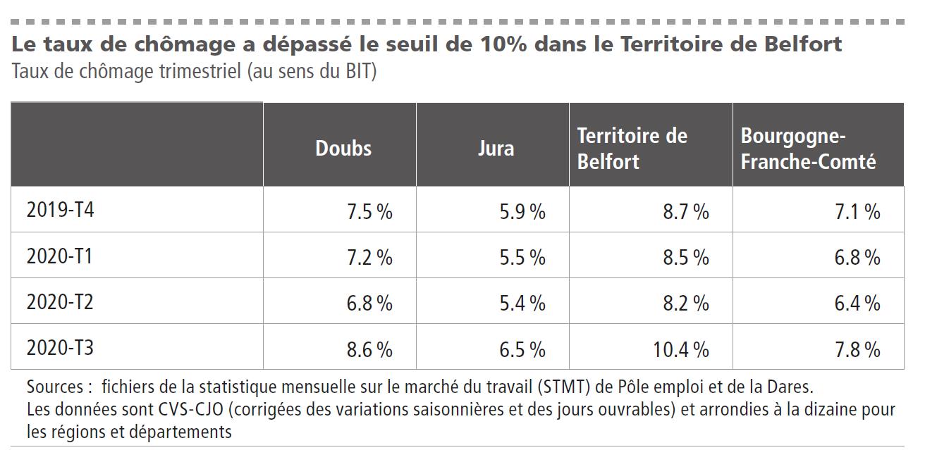 C’est dans ce département que le taux de chômage au sens du BIT a franchi la barre des 10 % au cours du troisième trimestre. Il a ainsi augmenté de plus de deux points par rapport au trimestre précédent, tout comme dans le département du Doubs voisin. Dans le Jura, la progression de 1 point est certes moindre mais reste importante.