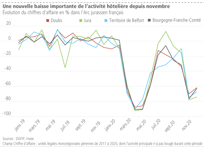 Ce secteur a alors vu son chiffre d’affaires s’effondrer à 10 % de son niveau habituel pendant presque trois mois. La saison estivale a été une accalmie où les départements les plus touristiques comme le Jura ont tiré leur épingle du jeu. Le Territoire de Belfort n’a lui jamais pu retrouver son niveau d’activité antérieur. Sur l’ensemble des activités touristiques et selon la comptabilisation des transactions des cartes bancaires, l’activité dans l’Arc jurassien français a été à peu près normale voire supérieure en juillet et en août à son niveau de l’année précédente.