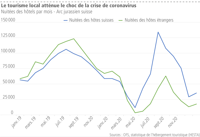 Le cumul des nuitées de l’année 2020 se monte à 1,12 million dans l’Arc jurassien suisse, représentant une baisse de 45 %,  plus marquée que la baisse observée au niveau national (- 40 %). La demande étrangère reste fortement en recul (- 65 %), alors que la baisse est moins forte (- 23 %) pour la demande indigène. Le tourisme local joue donc un rôle important pendant cette crise de coronavirus, il atténue le choc de l’absence de touristes internationaux mais il ne suffit pas à éviter les chutes importantes des nuitées constatées en 2020.