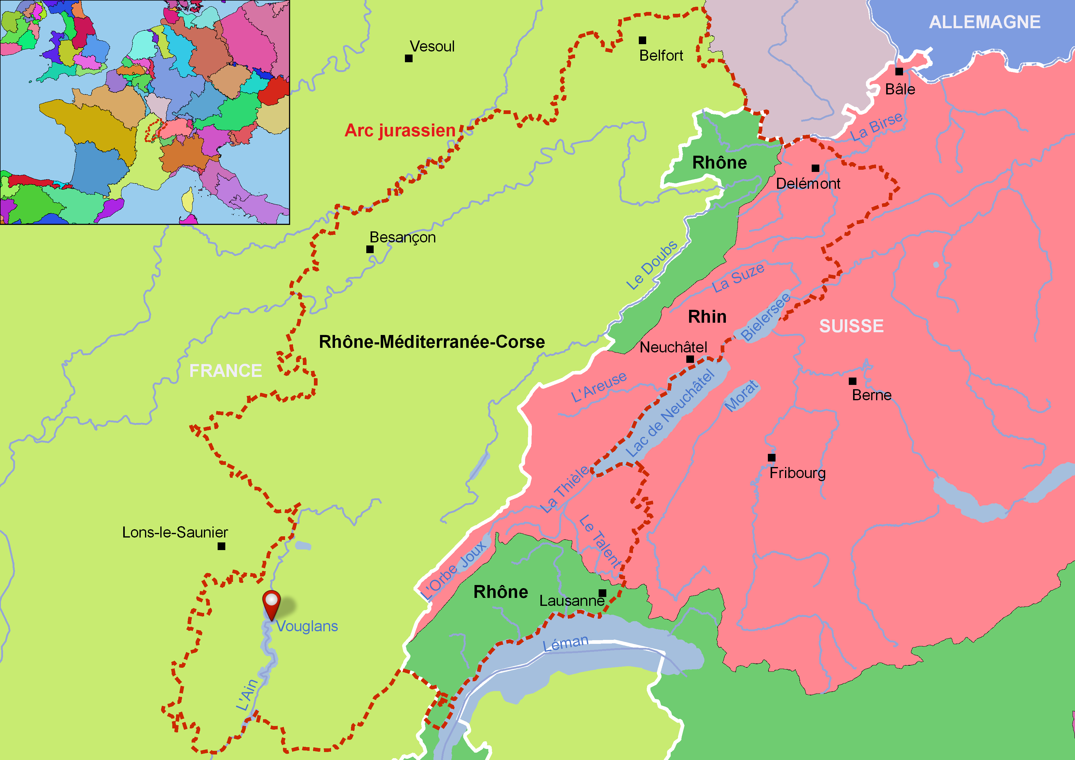 L’Arc jurassien est un pays d’eau, traversé par le Doubs qui prend sa source dans le massif du Jura et sert de frontière naturelle entre la France et la Suisse. Il se situe au confluent des bassins versants du Rhin et du Rhône.