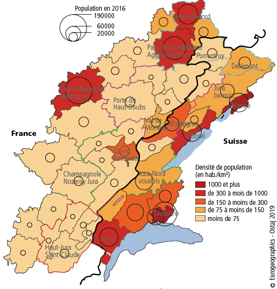 C’est dans les zones les plus peuplées de l’Arc jurassien que les prélèvements en eau domestiques sont les plus importants comme la partie française du territoire Nord Franche-Comté - canton du Jura où sont implantées les agglomérations de Belfort et de Montbéliard ou encore les rives du lac de Neuchâtel.