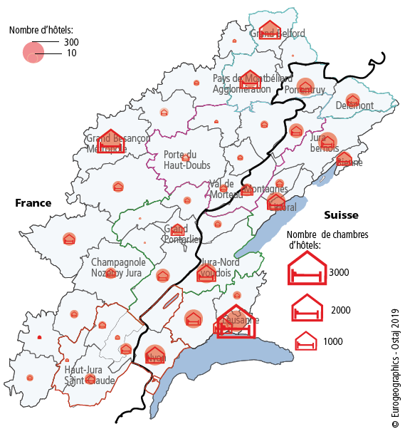 Dans les zones plus urbanisées de l’Arc jurassien, la clientèle des hôtels s’ajoute à une population résidente déjà nombreuse. Dans la partie française, les hôtels se concentrent dans les principales villes (Besançon, Montbéliard) et accueillent à l’année une clientèle d’affaire. Dans la partie suisse, les hôtels, répartis sur le territoire, attirent davantage une clientèle de loisir plus saisonnière. Au total, les hôtels de l’Arc jurassien accueillent ainsi chaque mois entre 200 000 et 400 000 nuitées.