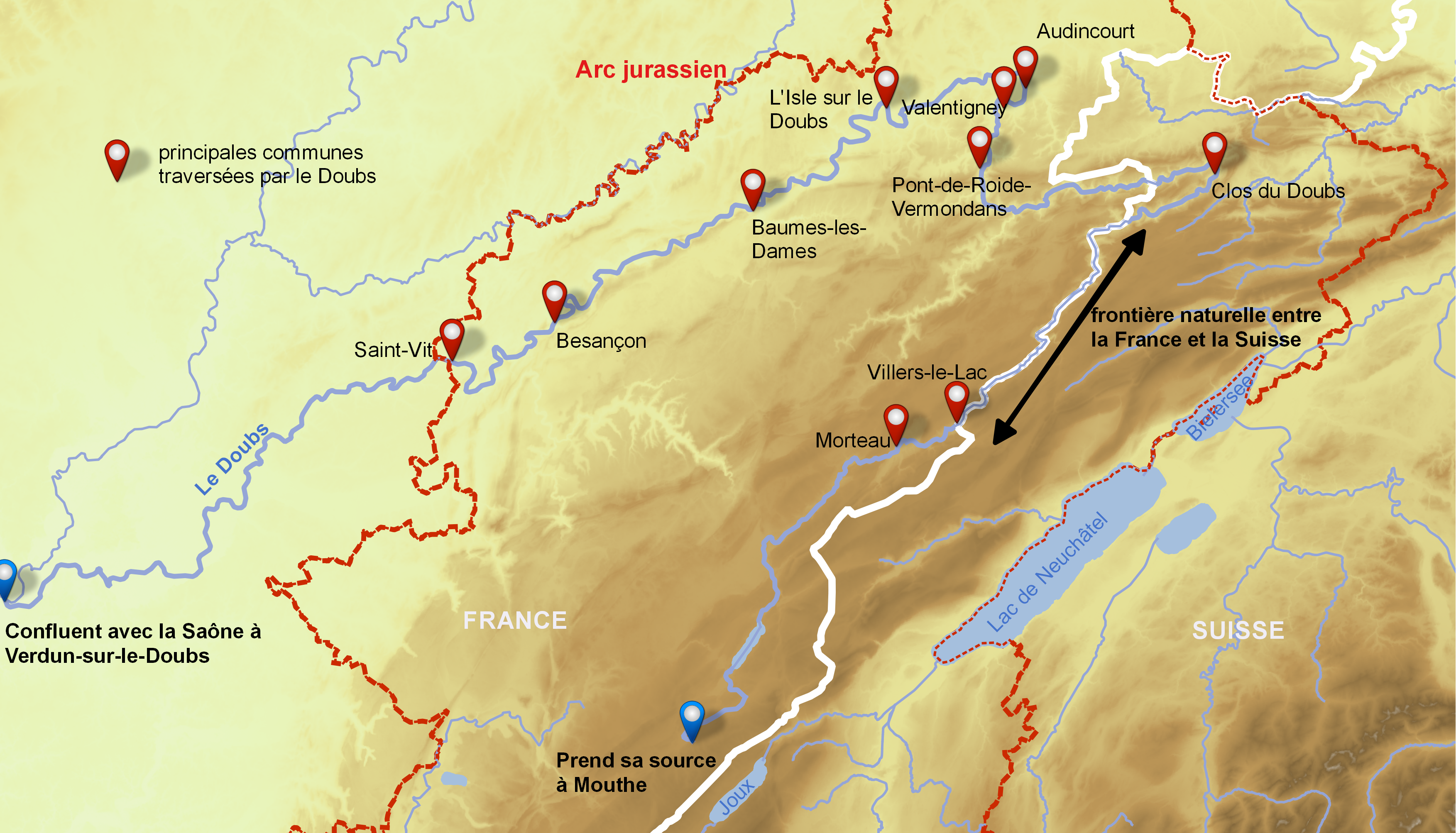 Le Doubs traverse le canton du Jura en Suisse et trois départements français. Sur son cours, il irrigue quelques villes notables telles que Besançon, Audincourt ou encore Morteau. D’une longueur totale de 450 km dont 80 en Suisse, le Doubs sert de frontière naturelle entre les deux versants de l’Arc jurassien.