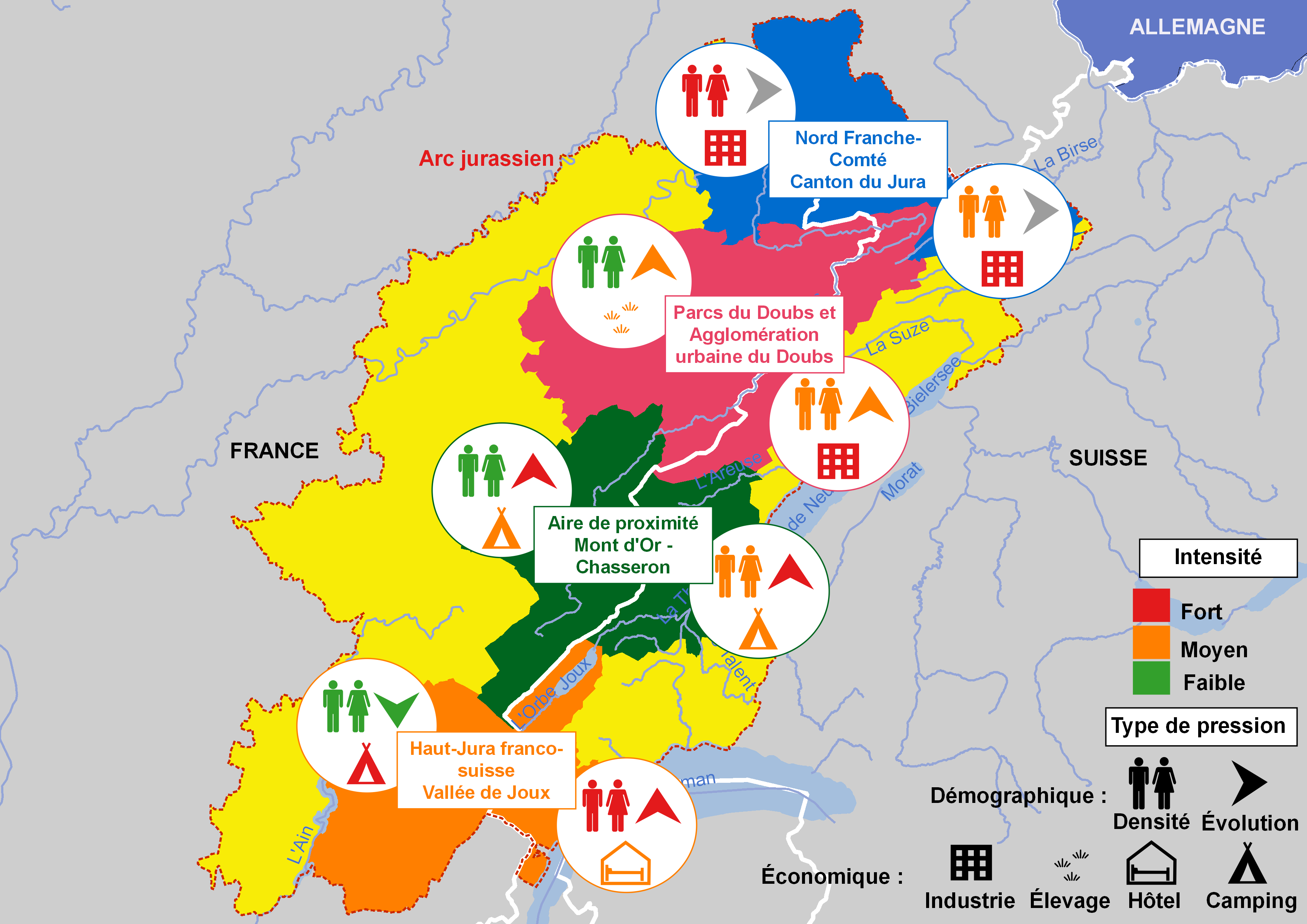 Cet usage de l’eau est sensible à la croissance démographique. En cinq ans, l’Arc jurassien a gagné 64 700 habitants, dont 57 000 dans la partie suisse déjà la plus densément peuplée. La quasi-totalité des districts suisses gagnent des habitants, avec une hausse record de 1,5 % par an dans ceux du canton de Vaud. Dans la partie française, la pression démographique, globalement stable, s’intensifie à proximité de la frontière et notamment au niveau de la source du Doubs (Mouthe) mais également entre Pontarlier et Morteau, là où le Doubs a subi des sécheresses importantes ces deux dernières années.